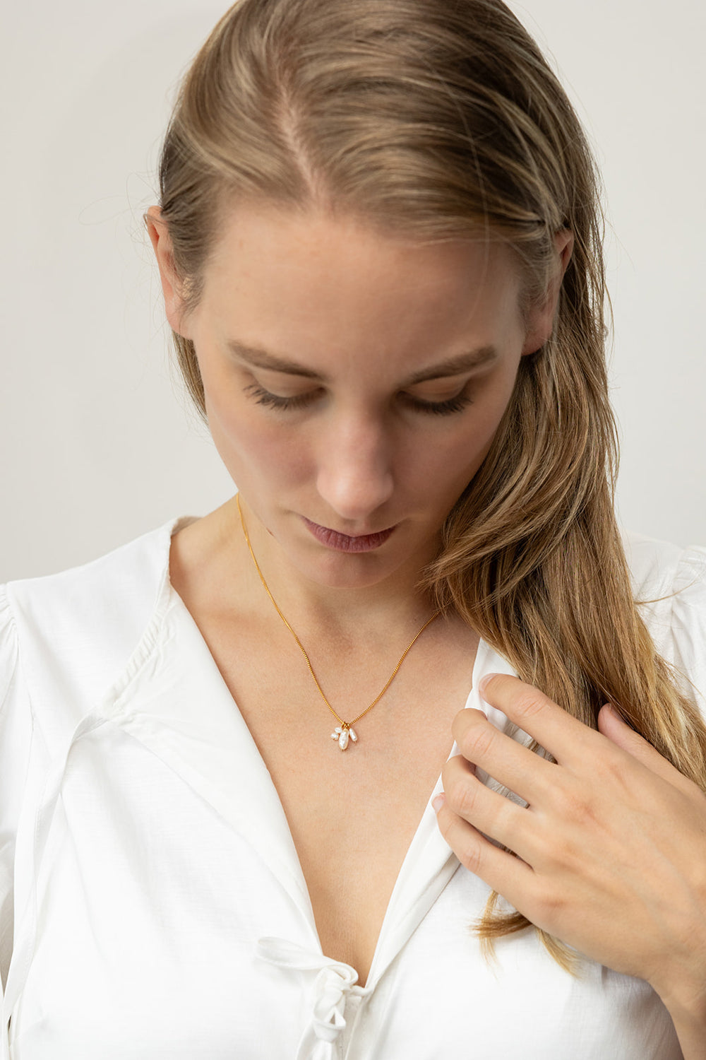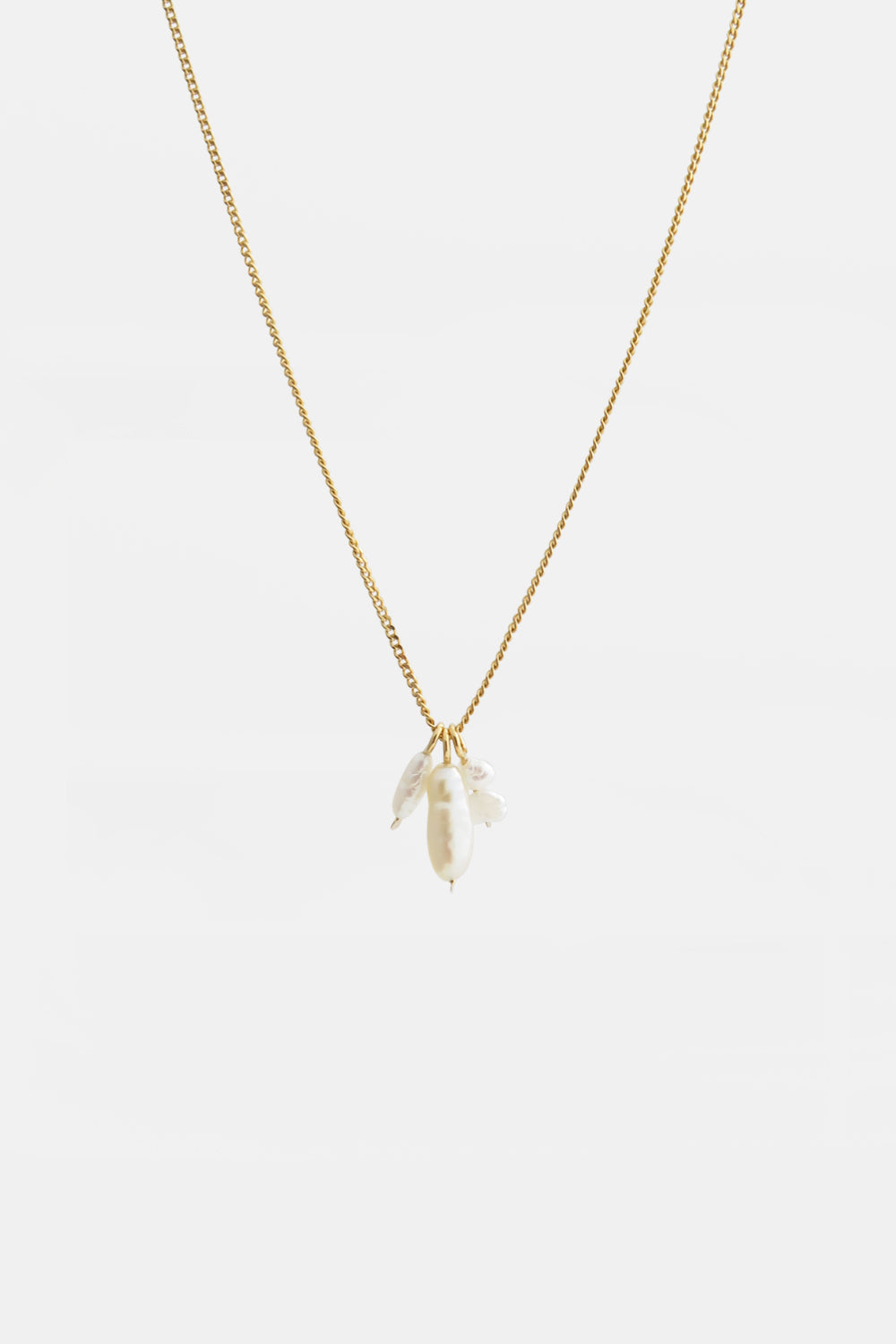 This necklace is crafted in gold-plated silver and adorned with three delicate freshwater pearls, aligned in a gentle, balanced composition.